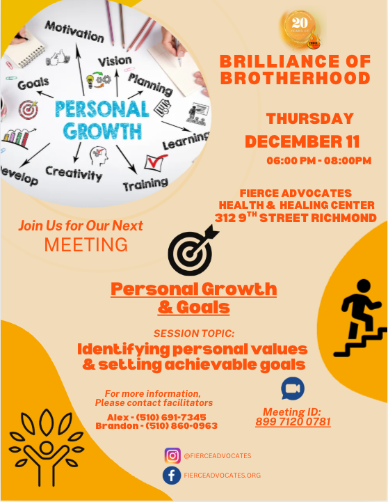 🧭 Topic: Identifying personal values & setting achievable goals 📅 Thursday, December 11 | 6:00–8:00 PM 📍 FIERCE Advocates Health & Healing Center 💻 Zoom ID: 899 7120 0781