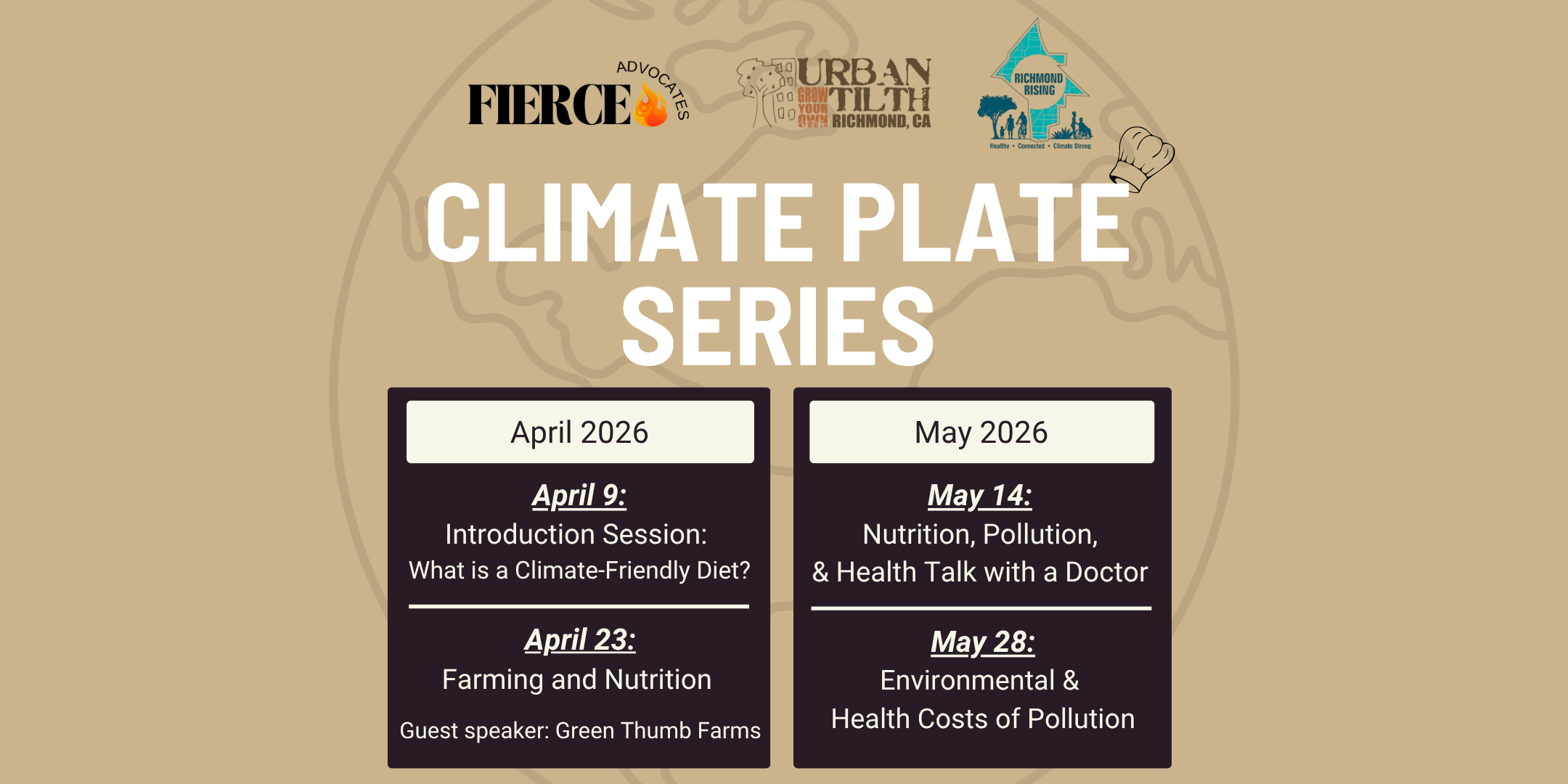 Join FIERCE Advocates and Urban Tilth for the Climate Plate Series, a 4-part workshop exploring how food, climate, and health are connected in Richmond. Through hands-on activities, cooking demos, and community conversation, participants will learn practical ways to support healthier eating using locally grown foods. Each session includes guest speakers, interactive learning, and a free bag of fresh produce to take home.